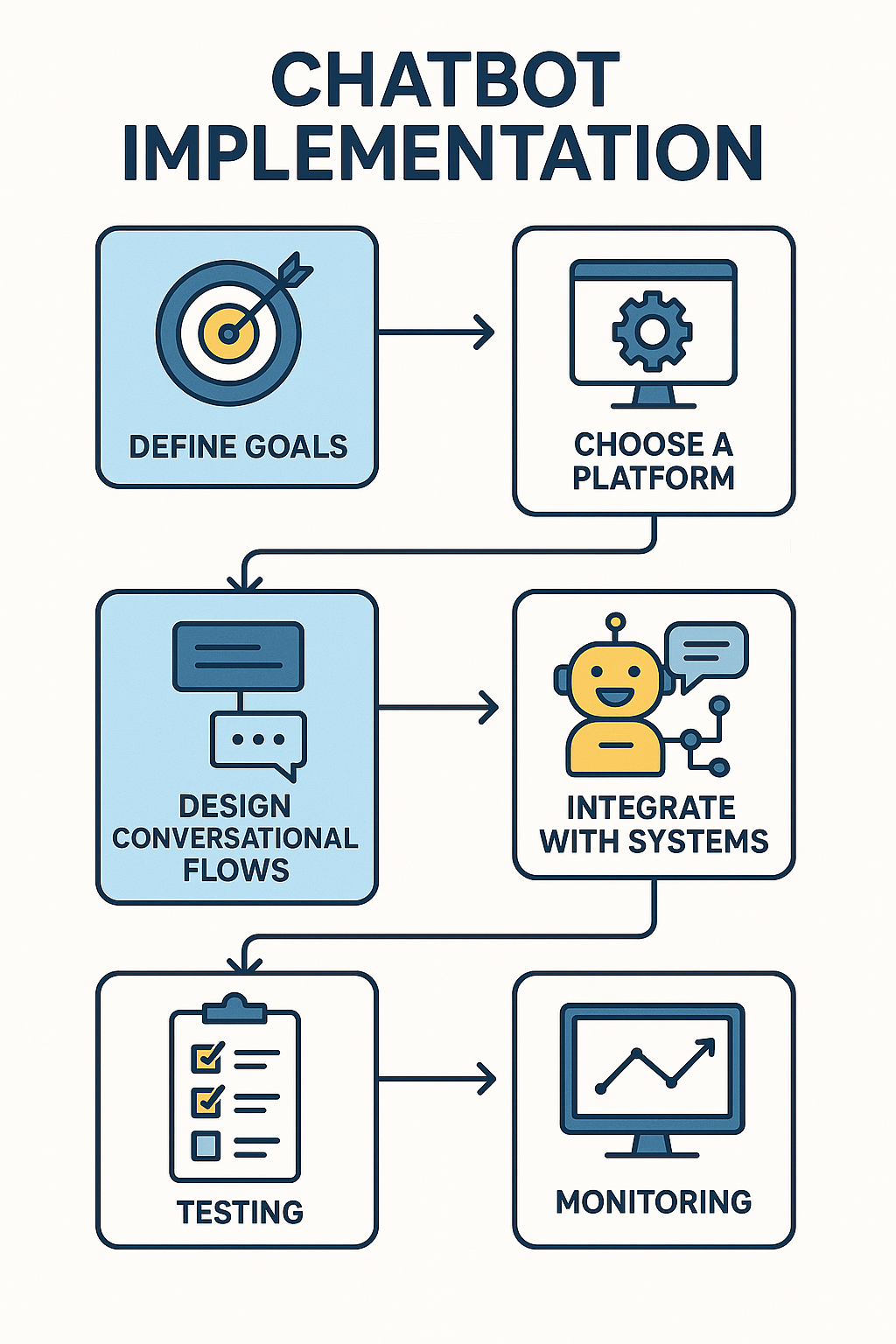 Here’s the quick recap: Define clear goals, pick the right chatbot platform, design engaging flows, integrate with your systems, test thoroughly, then monitor and improve.